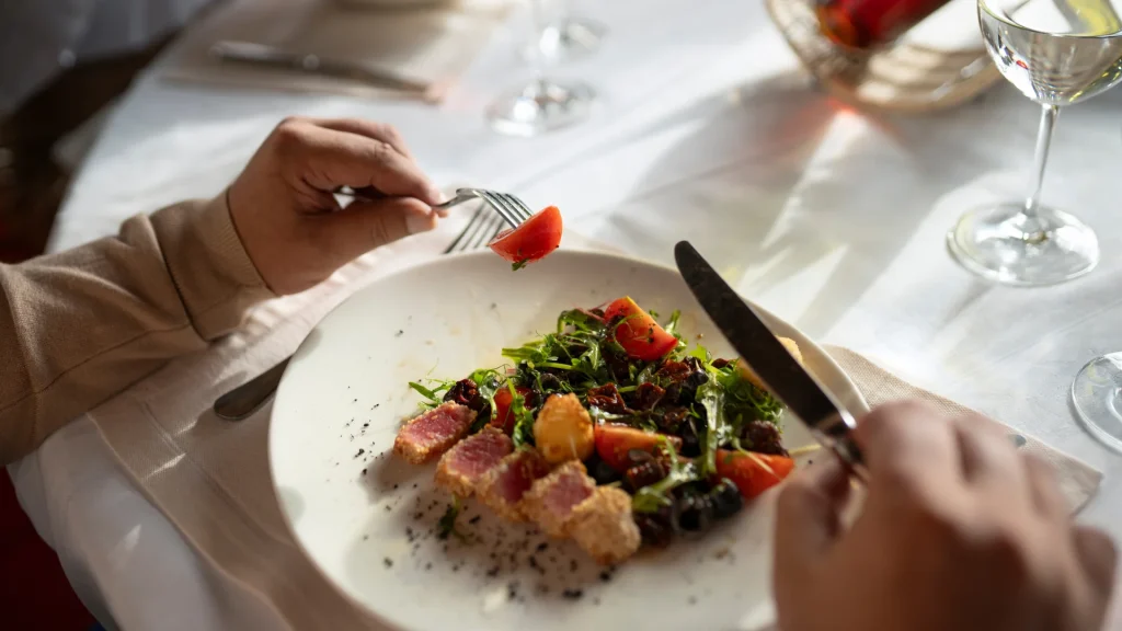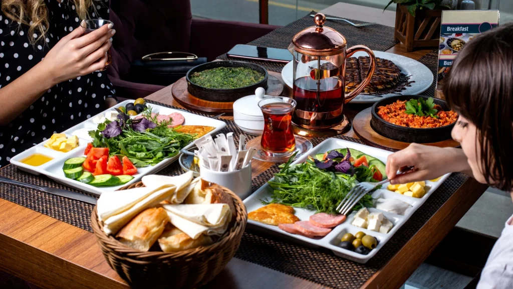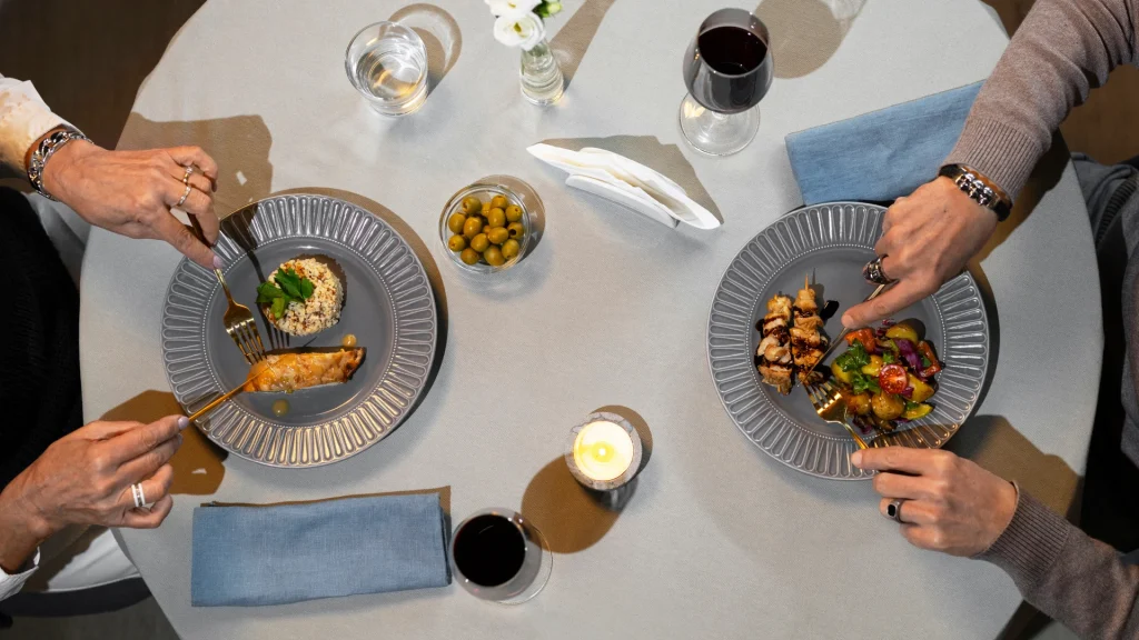 - Ana yemek: Ana yemek genellikle et, balık, tavuk ya da vejetaryen seçenekler olur ve yanında sebzeler, patates ya da pilav gibi tamamlayıcı yemeklerle birlikte servis edilir.